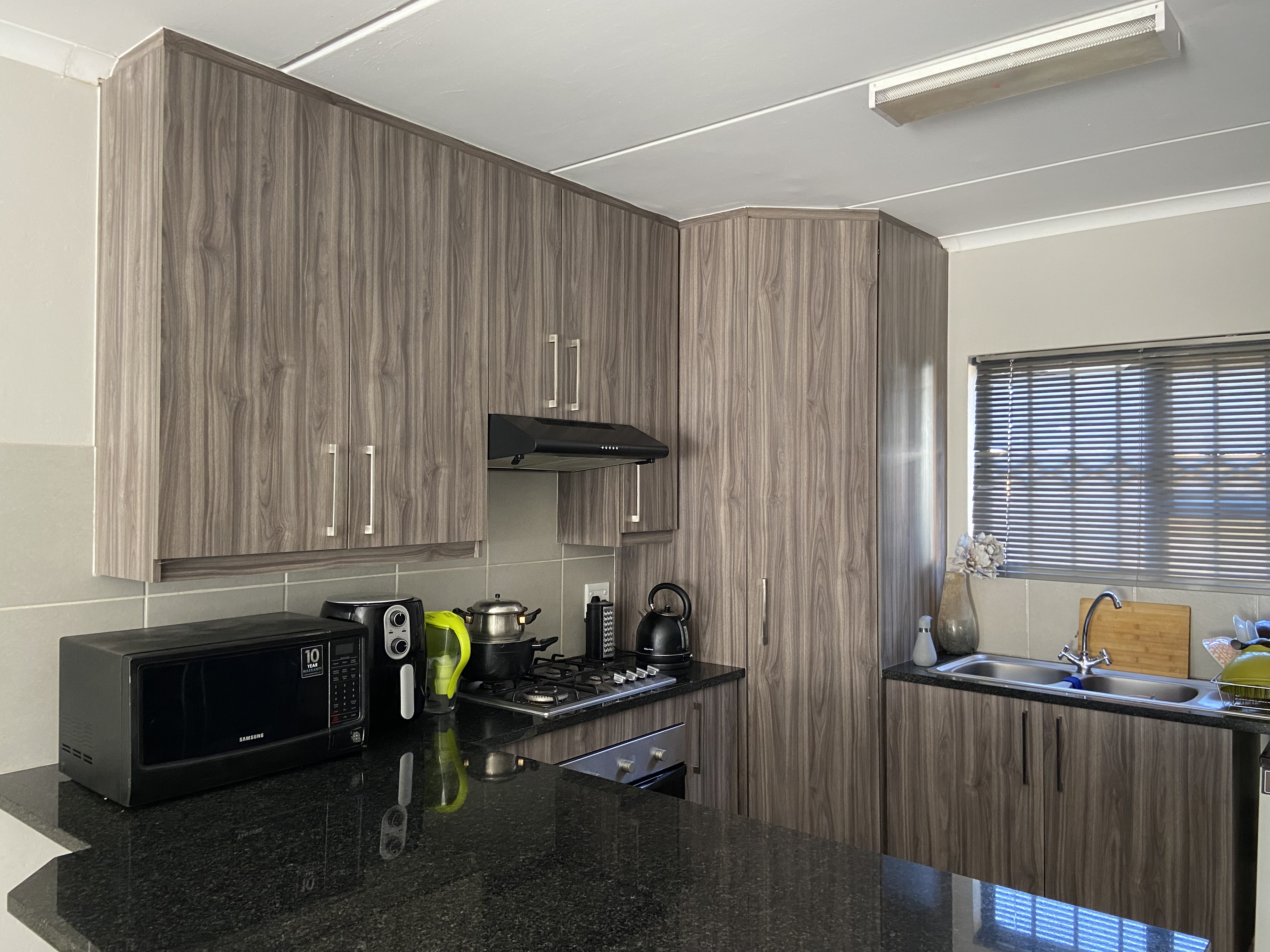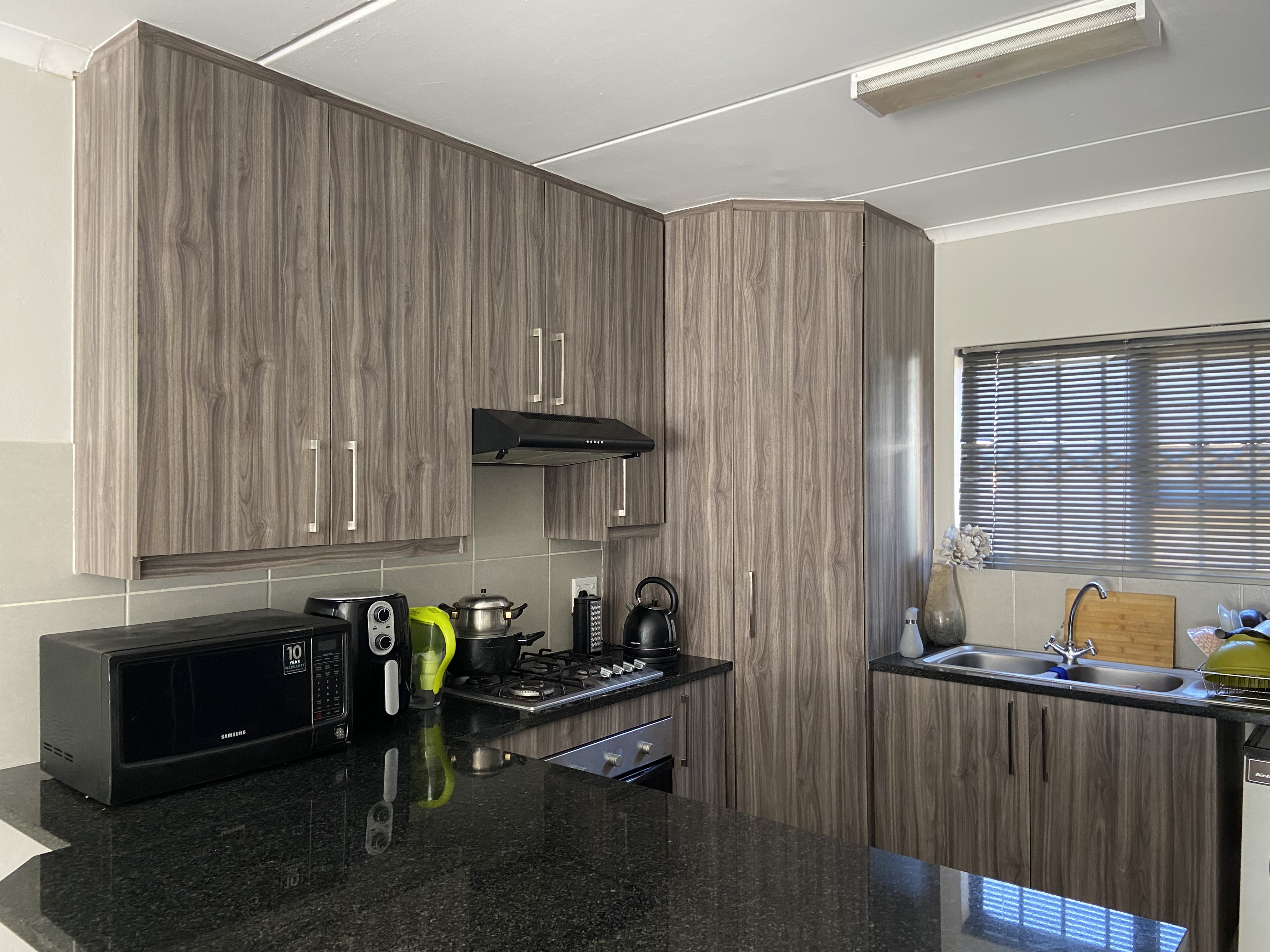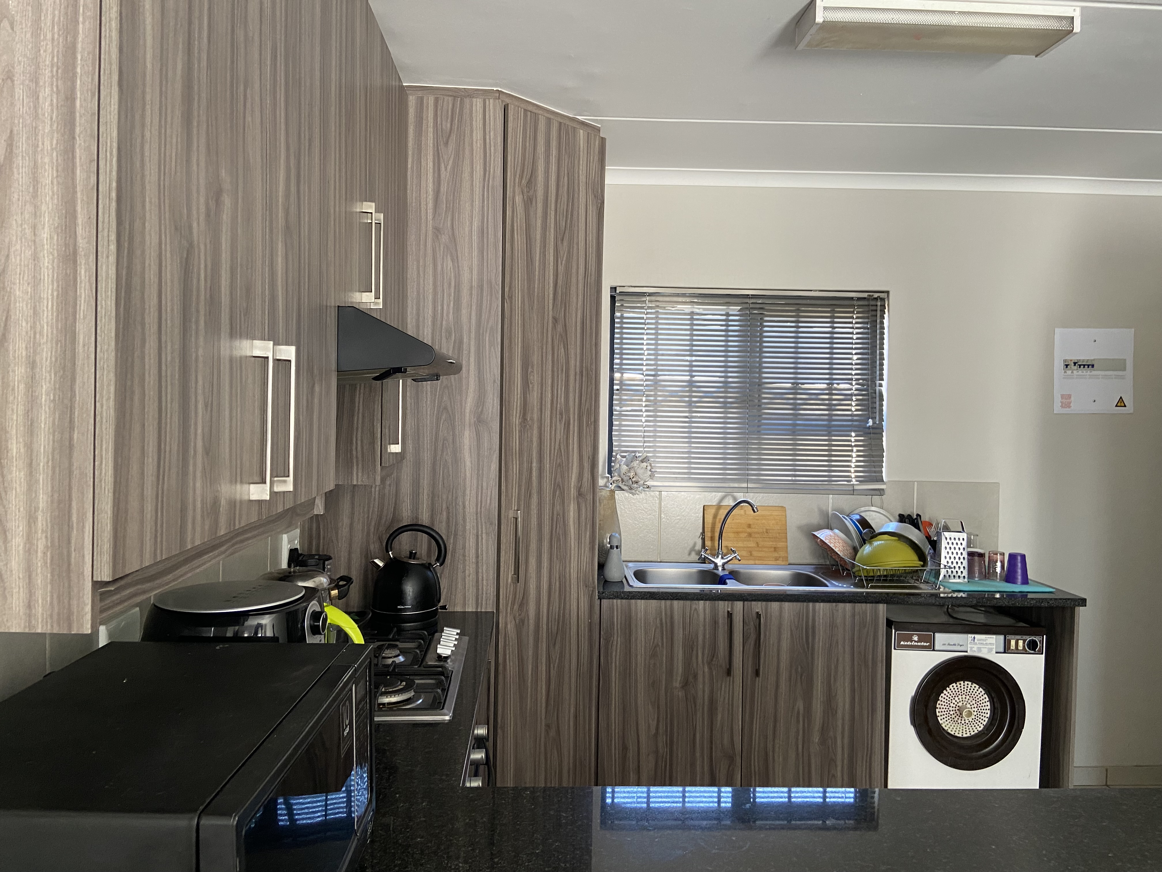 The modern kitchen has with quality fittings , ample storage space and "soft-close" cupboards. The breakfast nook has space for a small family kitchen stools and looks out over the the spacious living room. The generously proportioned interior flows effortlessly from the open-plan living space to the private covered patio with a built in braai and garden.