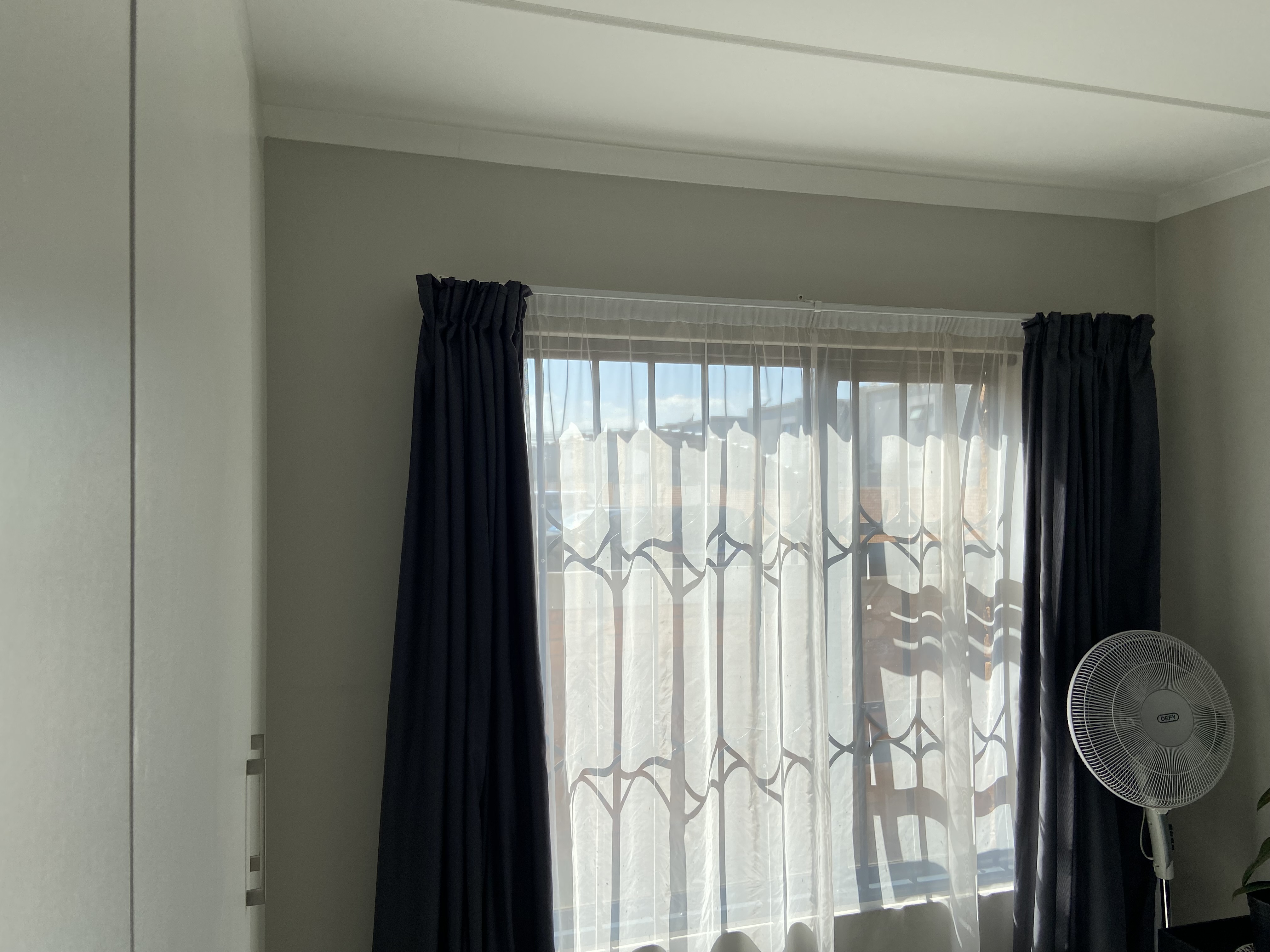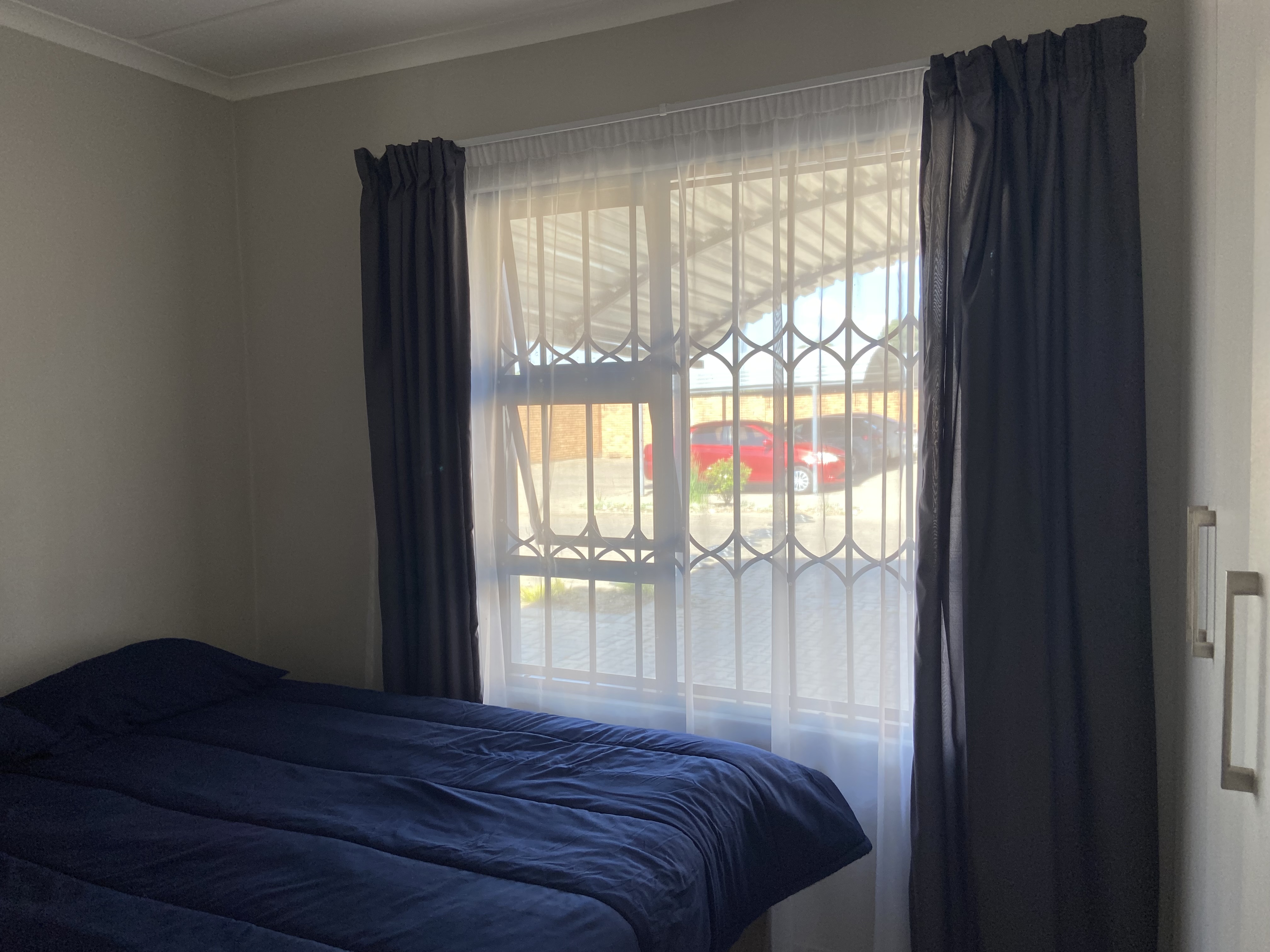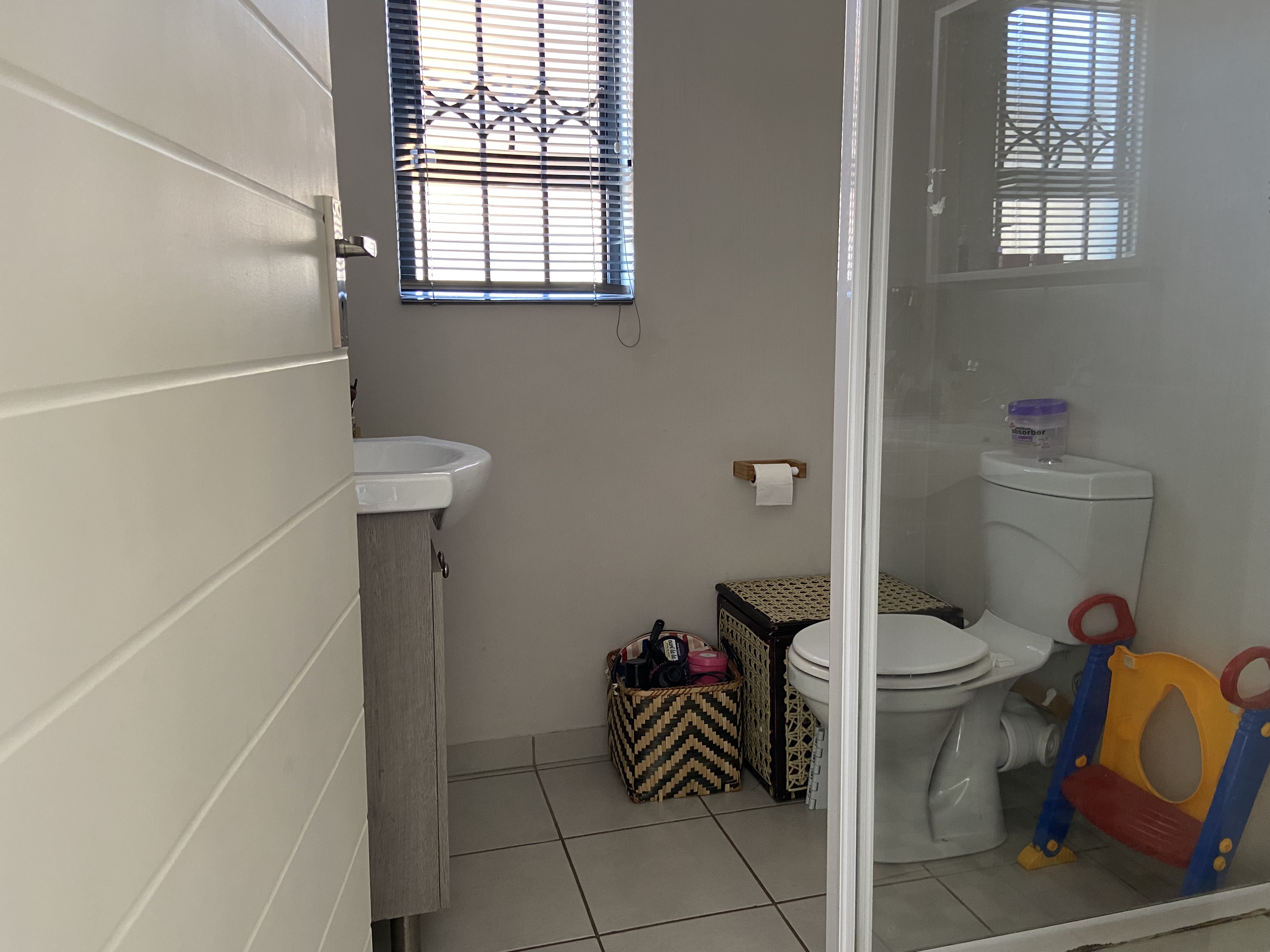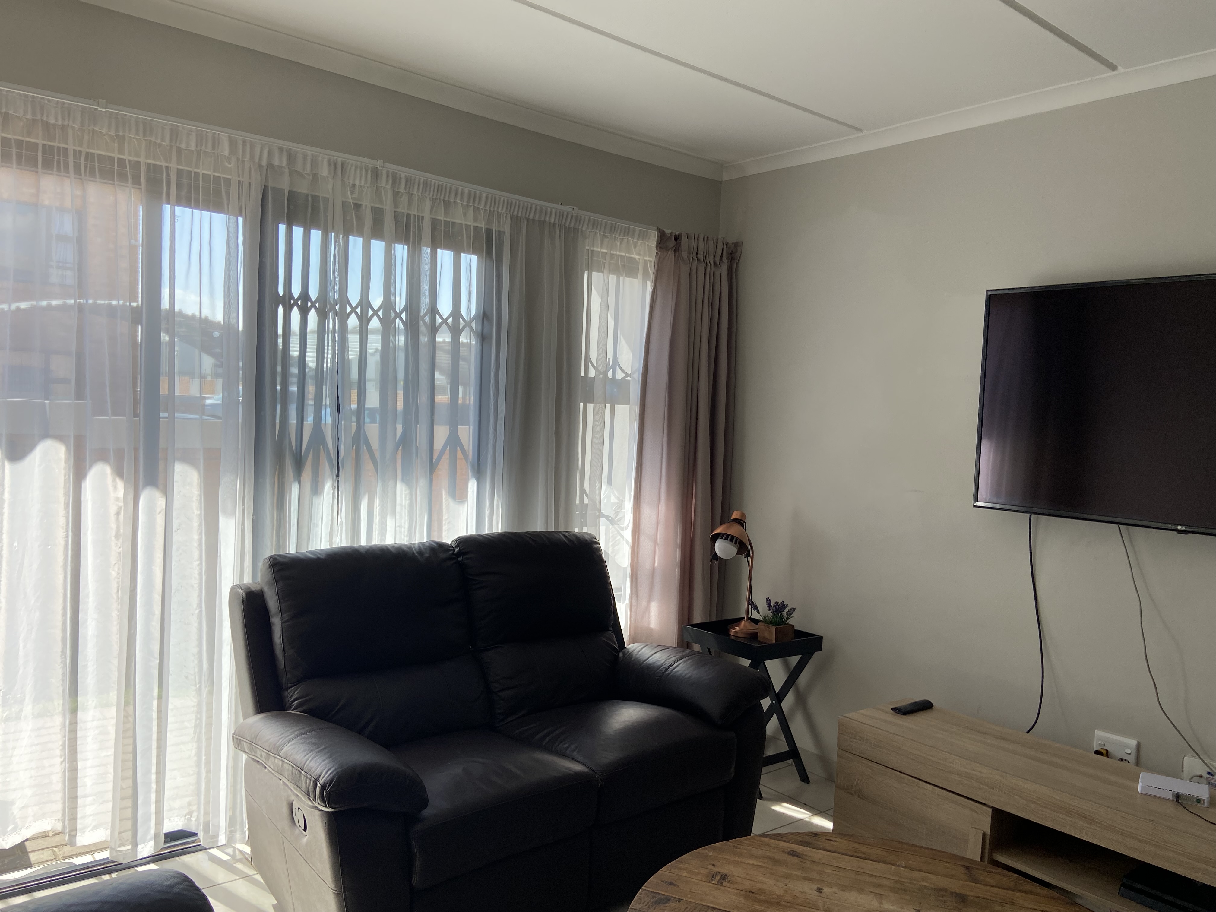 The modern kitchen has with quality fittings , ample storage space and "soft-close" cupboards. The breakfast nook has space for a small family kitchen stools and looks out over the the spacious living room. The generously proportioned interior flows effortlessly from the open-plan living space to the private covered patio with a built in braai and garden.